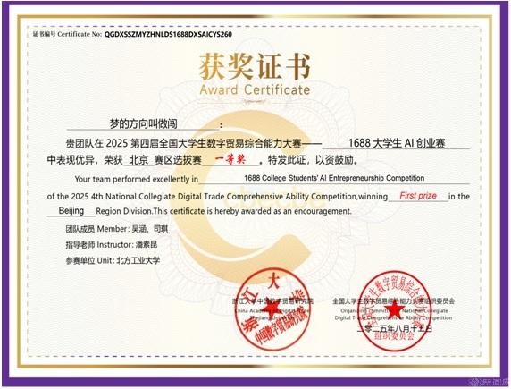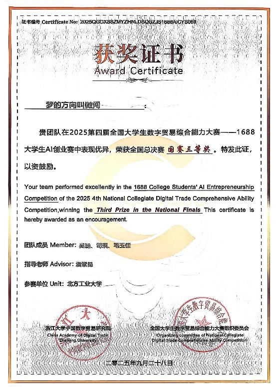 近日,由浙江大學中國數(shù)字貿(mào)易研究院主辦、全國大學生數(shù)字貿(mào)易綜合技能大賽組織委員會承辦的第四屆全國大學生數(shù)字貿(mào)易綜合技能大賽總決賽在浙江大學圓滿落幕。我校學生吳涵、司琪、毛玉佳組成的代表隊獲得北京賽區(qū)一等獎、全國總決賽三等獎。
