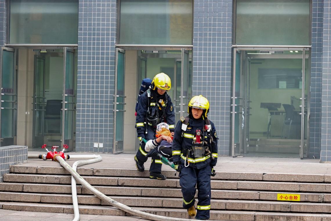 此次演習以學校圖書館突發火情、2000余名學生正在館內學習為背景,按照學校發現火情后立即組織自救,同時拔打“119”救助、通知友鄰首鋼工學院和首鋼醫院支援的基本流程,重點演練了火災接報警、初期火情處置、區域聯動、疏散逃生、營救被困人員、救治轉運傷員、火災撲救等科目。演習過程中,全體參演人員各負其責、緊密協作、有序疏散,通過近似實戰的演練場景,全面檢驗了相關單位快速反應、應急指揮能力,友鄰單位協同作戰、臨機處置能力,師生員工有序疏散、安全逃生能力,消防救援快速到達、精準施救能力,進一步探索完善了區域消防協作模式。