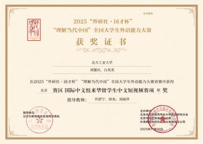 近日,2025“外研社·國才杯”“理解當代中國”全國大學生外語能力大賽北京賽區省賽落幕,北方工業大學國際學生團隊在國際中文組中文短視頻賽項中斬獲三項銀獎,充分展現了學校國際學生教育的扎實成效與國際學生的中文應用實力。
