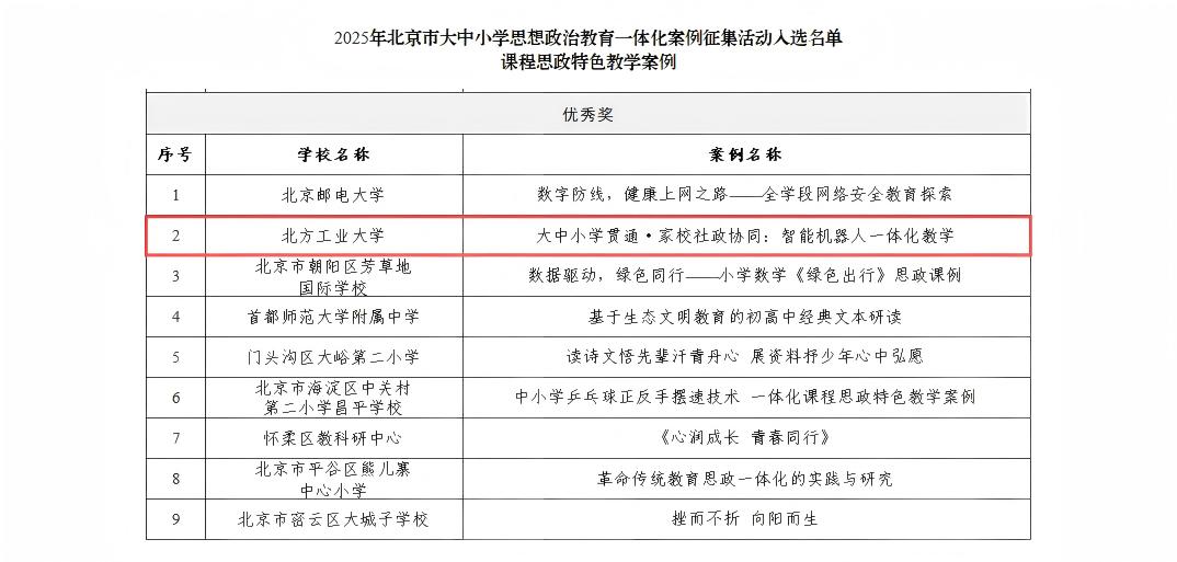 近日,2025年北京市大中小學思想政治教育一體化主題活動案例征集評審結果公布,我校機械與材料工程學院申報的《“思政紅+科技藍”高校引領打造全學段立體化大思政實踐模式》獲“大思政課”創(chuàng)新實踐案例二等獎,電氣與控制工程學院申報的《大中小學貫通·家校社政協(xié)同:智能機器人一體化教學》獲課程思政特色教學案例優(yōu)秀獎。
