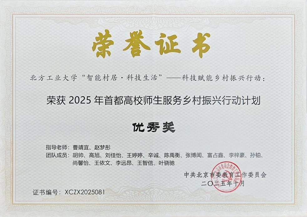 “‘智能村居·科技生活’——科技賦能鄉村振興行動”項目由機械與材料工程學院曹靖宜、趙夢彤指導學生團隊完成。項目立足機材學院學生專業優勢,圍繞紅色教育傳承、特色產業賦能、美育文化浸潤、科技創新啟蒙四大維度,推動物聯網、大數據等前沿技術在鄉村治理中的創新應用,突破傳統鄉村發展模式的技術壁壘,在校地協同中搭建起知識服務與鄉村振興的橋梁,為大興區鄉村高質量發展注入青春活力。