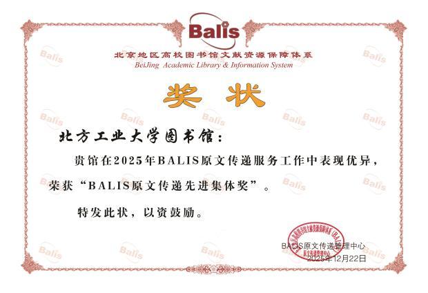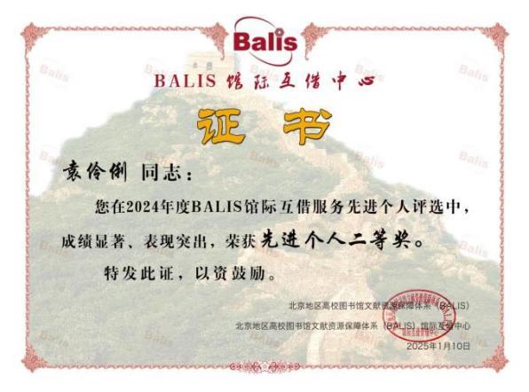 副館長崔澤永榮獲“北京地區高校圖書館優秀館長”稱號,采編部主任鐘凱榮獲“北京地區高校圖書館優秀館員”稱號。在北京高校網絡圖書館(網圖)聯盟舉辦的“優秀大學生管理員”評選中,21 名 “藍馬甲” 學生館員榮獲該殊榮。在2024年度BALIS館際互借服務先進評選中,圖書館榮獲“先進集體三等獎”,借閱部主任(代)袁伶俐榮獲“先進個人二等獎”。2025年BALIS原文傳遞服務工資評選中,圖書館榮獲“BALIS 原文傳遞先進集體獎”,咨詢部館員王正為榮獲“先進個人獎”。