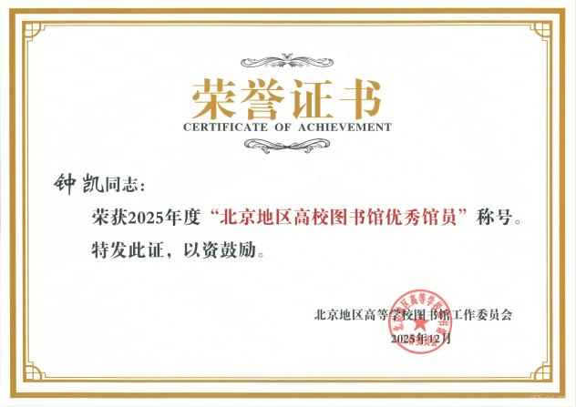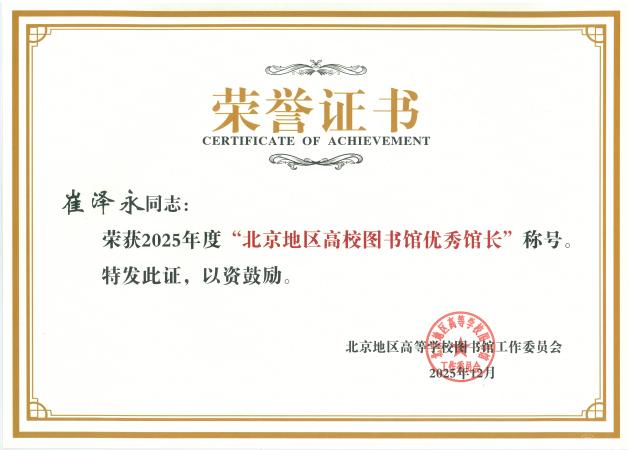 近日,我校圖書館在2025年北京高校圖書館工作委員會(以下簡稱北京高校圖工委)評優中取得良好成績。