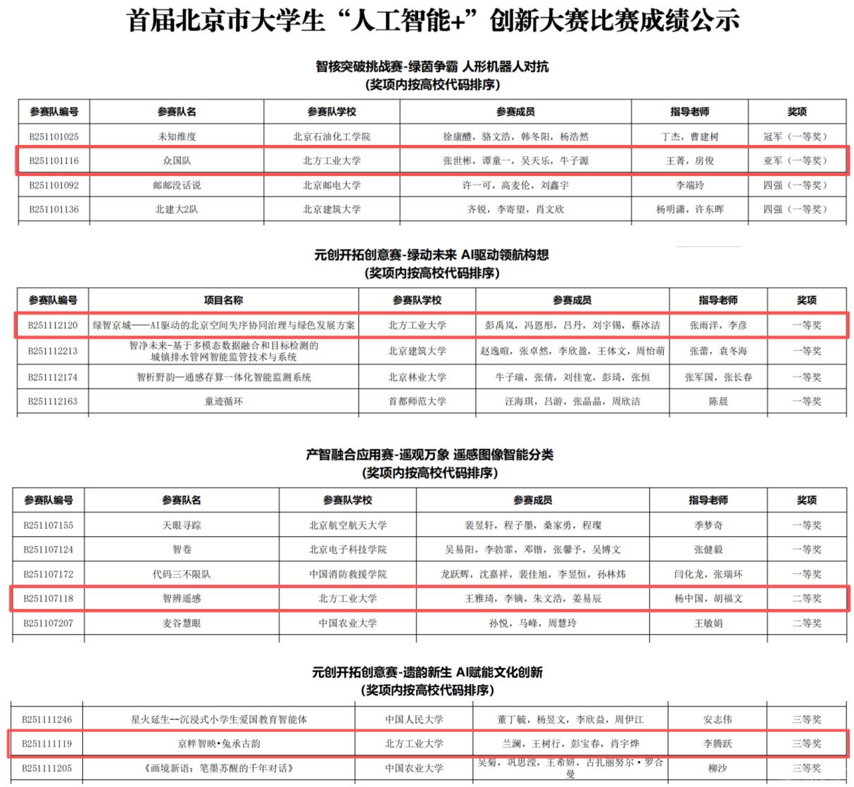自11月底大賽啟動,在校教務處指導和人工智能與計算機學院組織下,人工智能專業王菁老師及專業團隊負責校賽工作,吸引了全校同學的廣泛關注與積極參與,通過嚴格的校內評審與選拔,最終推薦5支隊伍參加北京市總決賽。經過現場激烈角逐,我校在“智核突破挑戰賽-綠茵爭霸 人形機器人3V3足球”賽題中獲得一等獎(亞軍),“元創開拓創意賽-綠動未來 AI驅動領航構想”賽題中獲得一等獎,“產智融合應用賽-遙觀萬象 遙感圖像智能分類”賽題中獲得二等獎,“元創開拓創意賽-遺韻新生 AI賦能文化創新”賽題中獲得三等獎。