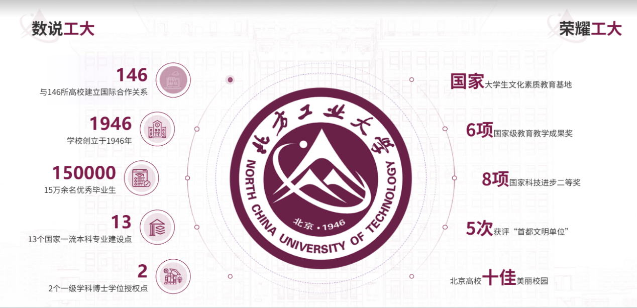 1.頁面整體采用長滾式布局,分為8個全屏展示,以“工大紫”為主色調,體現學校“興工報國”文化傳統;以藍色為輔色,突出工科院校的特征;融入校徽、輔助圖形、點、線、校園建筑等元素,彰顯北方工大特色。