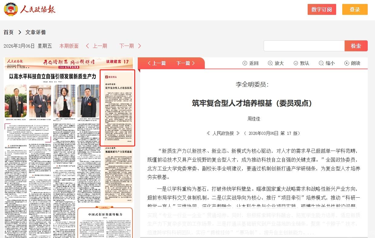 憑借扎實的專業研究和豐富的履職思考,李全明教授先后接受人民政協報、中國應急管理報、中國煤炭報、國家電網報、中國黃金報、中國能源觀察等多家媒體采訪報道,圍繞復合型人才培養、創新驅動發展戰略實施、電網韌性提升、礦山智能化開采、安全生產底線堅守等熱點議題發表委員觀點,發出北方工大聲音。 此前,李全明教授的履職故事被中華人民共和國應急管理部專題報道,其推動安全領域法規完善、加大資源投入,筑牢公共安全基石的實踐與思考,成為政協委員扎根領域、履職為民的生動范例。理論文章《實施創新驅動戰略是中央企業的使命擔當》在《中國石化》頭版刊發,從中央企業發展視角為實施創新驅動戰略提出見解,彰顯了深厚的理論功底和行業視野。