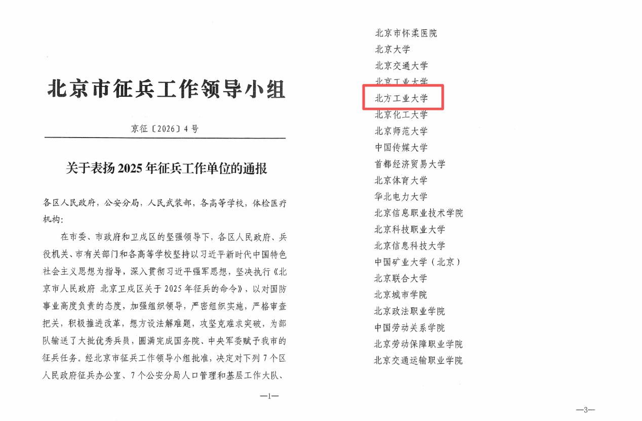 近日,北京市征兵工作領導小組印發《關于表揚2025年征兵工作單位的通報》,對7個區人民政府征兵辦公室、7個公安分局人口管理和基層工作大隊、7個征兵體檢醫療機構和20所高校予以通報表揚。我校獲評北京市2025年征兵工作先進單位,這是連續第七年獲此榮譽,充分彰顯了學校國防育人的深厚積淀和征兵工作的扎實成效。