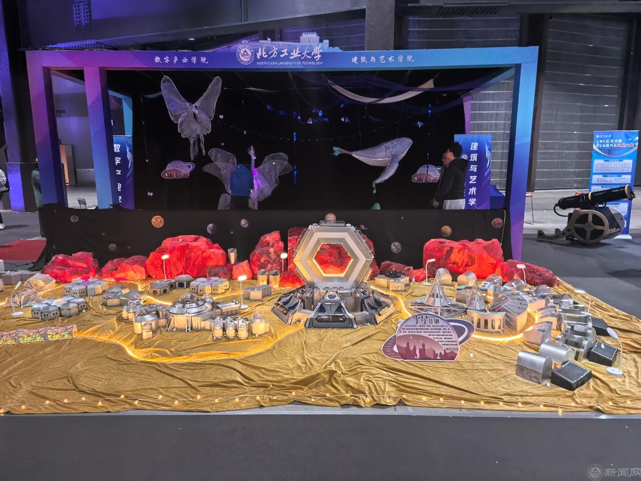 數(shù)字產(chǎn)業(yè)學院與建筑與藝術學院聯(lián)合打造的大型概念模型“火星基地 2026”,一經(jīng)亮相便吸引眾多目光。這座微縮“火星城市”精準集成中控指揮、住宅生活、生態(tài)循環(huán)、物資運輸、科研能源及可擴展艙段六大功能模塊,LED 燈帶、柔性氣囊與自主機器人的協(xié)同運行,讓未來火星基地的科幻場景鮮活呈現(xiàn)。據(jù)悉,該作品源自建筑數(shù)字化設計Studio項目制課程,由學生團隊獨立完成從創(chuàng)意構思到實物落地的全流程,盡顯北工大學子的創(chuàng)新思維與實踐能力。