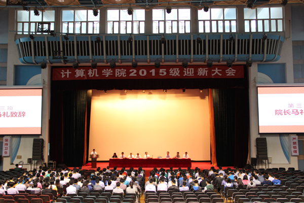 9月10日下午,計算機學院2015年級迎新大會在體育館二層隆重舉行。學校紀委書記王建穩、學院院長馬禮、院黨委書記劉文楷、副院長宋威、副書記楊朋及各系、實驗中心主任出席了迎新大會并在主席臺就座,2015級班導師、輔導員及全體新生參加了大會。大會由學院黨委副書記楊朋主持。