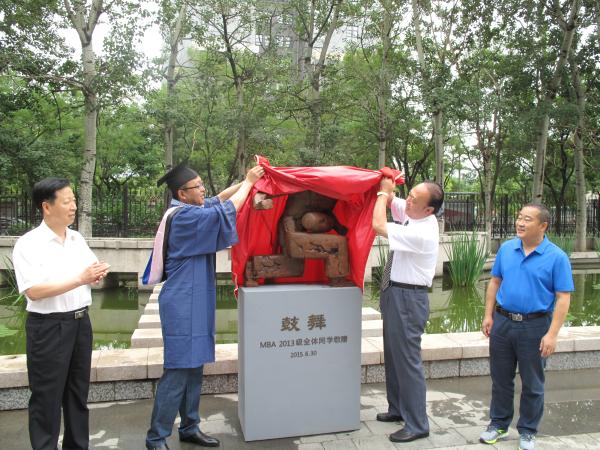 2015年6月30日上午,MBA2013級全體畢業生向學校捐贈“鼓舞”雕像儀式在體育館前舉行。校友會常務副會長、副校長楊軍出席捐贈儀式。校友會秘書長、學校辦公室主任張萌萌,經濟管理學院院長劉永祥,MBA中心主任趙繼新和MBA2013級全體同學參加了捐贈儀式。