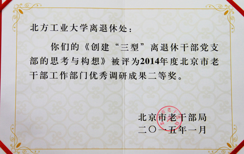 近日,從北京市老干部局獲悉,我校離退休工作處撰寫的調(diào)研報(bào)告《創(chuàng)建“三型”離退休干部黨支部的思考與啟示》榮獲2014年度全市老干部工作部門優(yōu)秀調(diào)研報(bào)告二等獎(jiǎng)。該調(diào)研報(bào)告由原副校長(zhǎng)李長(zhǎng)生執(zhí)筆,離退休工作處李金山、趙永兵、張勝軍、王非、劉廷益、李喜田、穆祥綱和黃玉法等組成課題組。