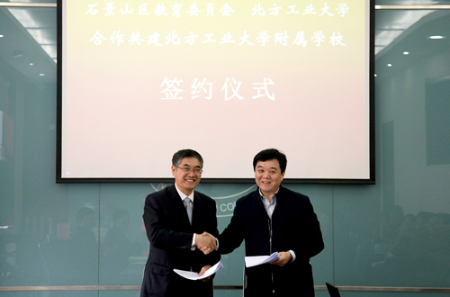 2015年4月8日上午,石景山區教委與北方工業大學合作共建北方工業大學附屬學校簽約儀式在石景山區教委三層會議室舉行。王曉純校長代表我校與石景山區教委簽署了“北京市石景山區教育委員會與北方工業大學關于合作共建北方工業大學附屬學校的協議書”和“北京市石景山區教育委員會與北方工業大學合作備忘錄”。石景山區委常委、副區長田利躍,石景山區教委主任郝顯軍,學校辦公室主任張萌萌,北方工業大學附屬學校理事會理事劉喜波、譚旭東出席了簽約儀式。