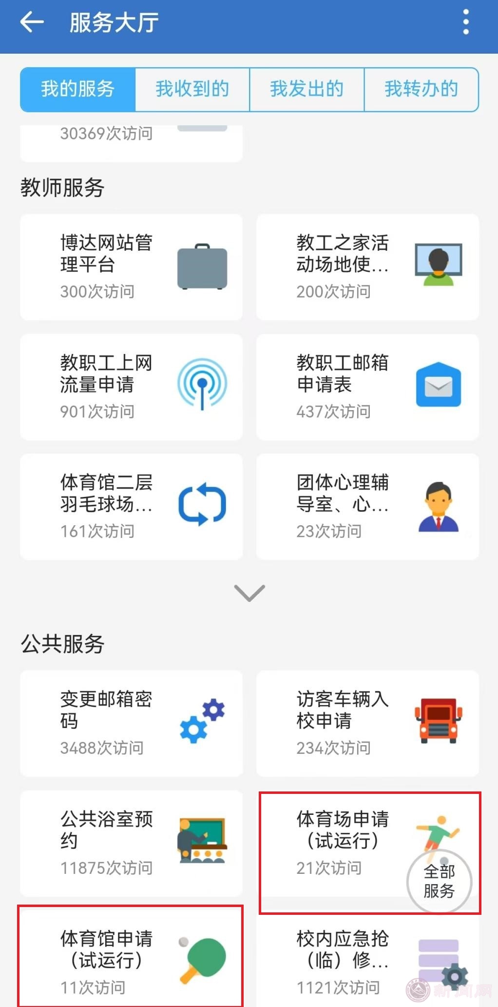 為簡化校內體育場館使用申請流程,提高審批效率,體育場、體育館線上申請系統(tǒng)現(xiàn)開通試運行。在校教職工可登錄校園網(wǎng)或企業(yè)微信,在服務大廳公共服務頁面進行申請預約。