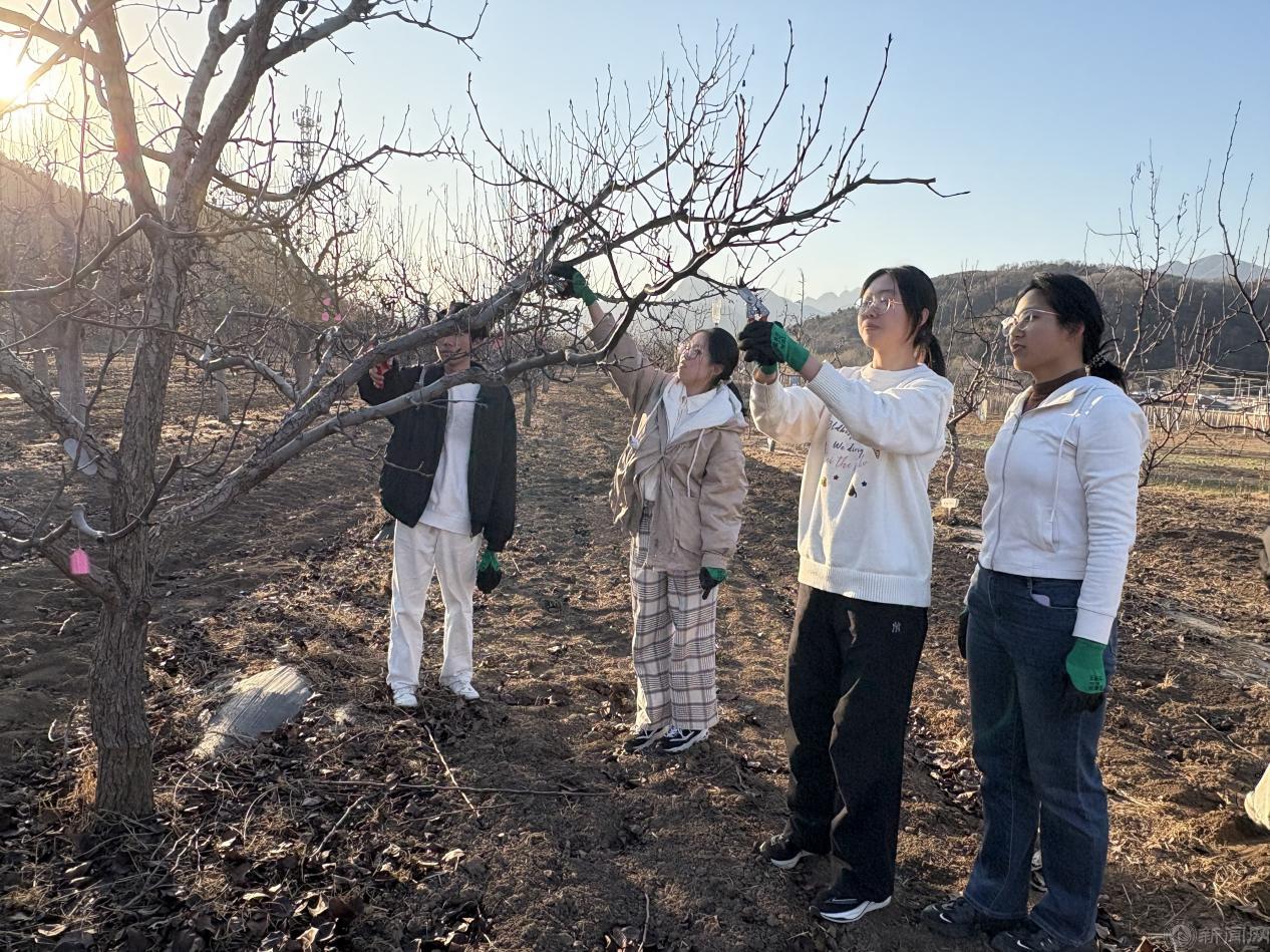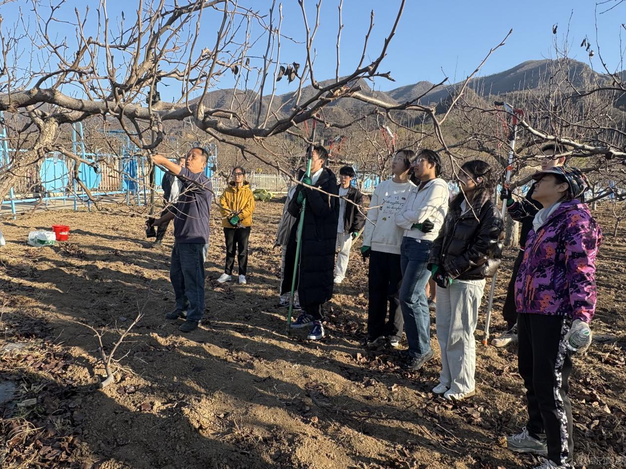 實踐環節,同學們系統學習了果樹修剪的精妙技藝,領悟到其“形”“產”兼顧的科學內涵。園中培育的新一代樹苗采用“Y字型”栽培模式,更適合機械化作業與自動化監測,讓同學們對科技賦能產業有了更具象的認知。學生們親手執剪,于枝葉取舍間,完成了從理論到實踐的關鍵跨越。