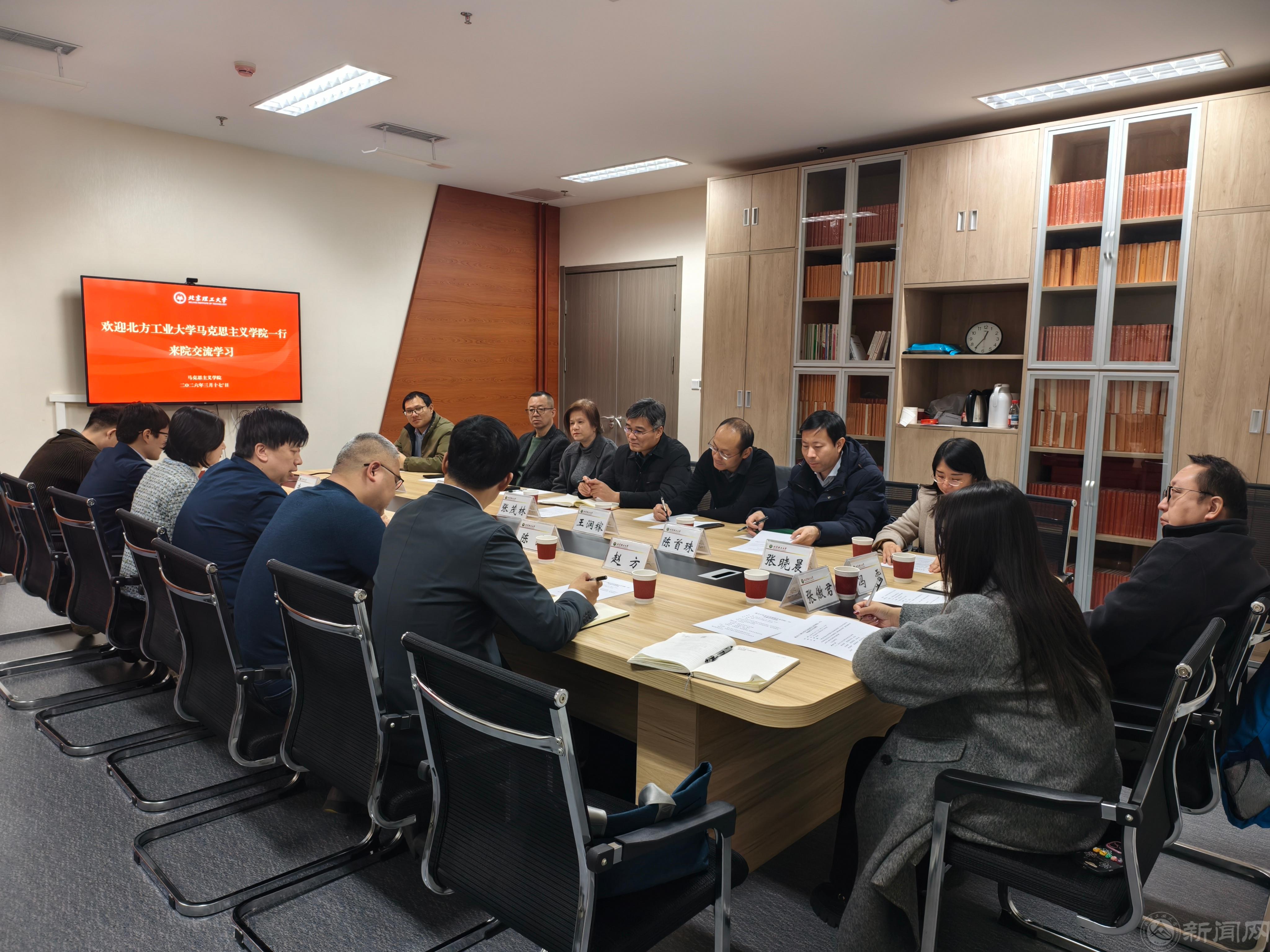 為學習北京市重點馬克思主義學院建設經驗,探索數字賦能思政育人新路徑,深化思政課程教學改革,3月17日,馬克思主義學院黨委副書記、院長張茂林帶隊一行,赴北京理工大學馬克思主義學院開展交流學習。北京理工大學馬克思主義學院院長劉新剛、副院長張虹及相關教師代表熱情接待并參與交流。