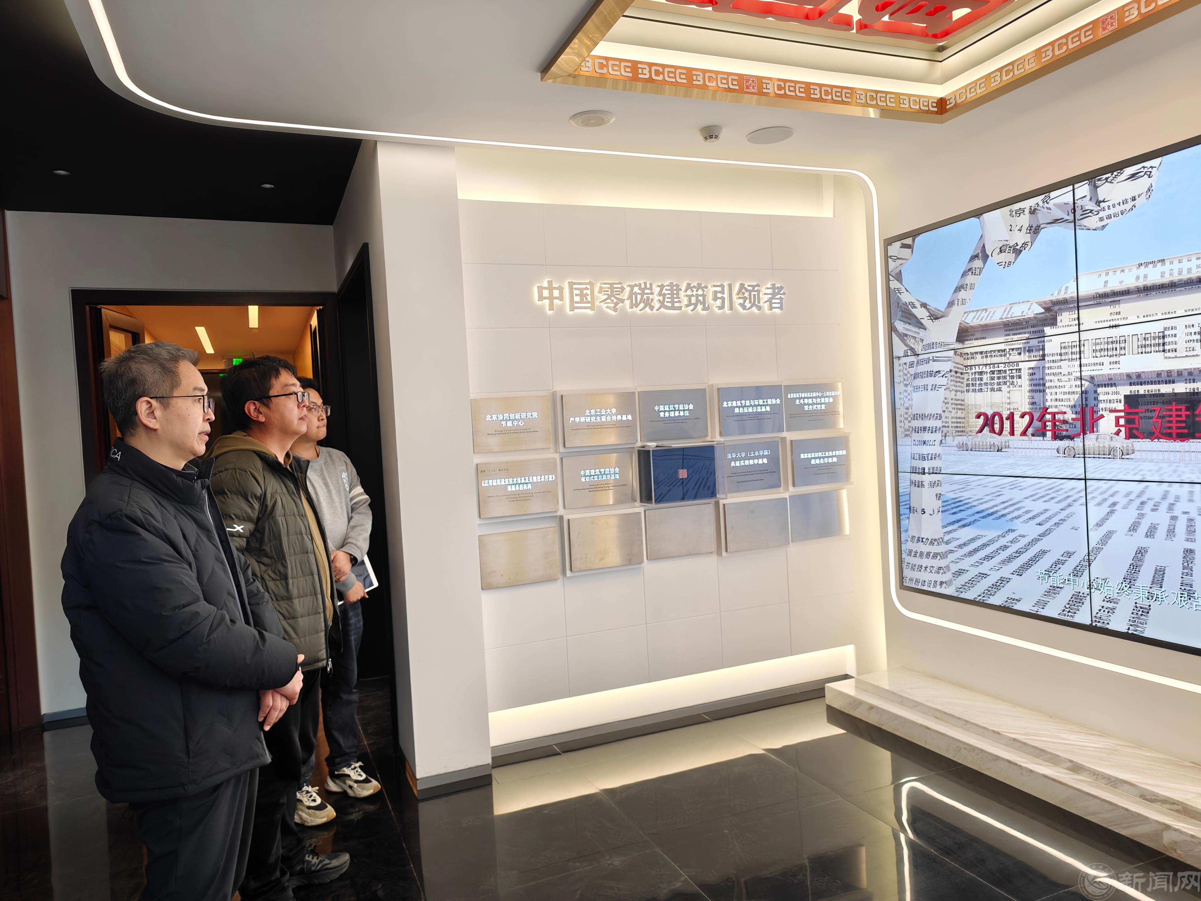 座談會前,學院教師參觀了北京節能成果展廳。展廳系統展示了近年來在綠色建筑、圍護結構節能技術、智慧運維等領域的研究成果。代云詳細介紹了多項創新節能技術在實際項目中的轉化與應用情況,并與學院教師進行了現場交流。
