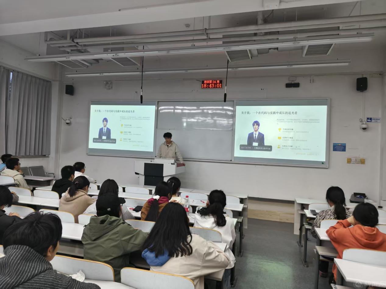 分享會上,三位優秀同學結合自身經歷,傾囊相授寶貴經驗,為在場同學提供了針對性的指導。周順元校友聚焦保研賽道,詳細拆解了保研準備的全流程,從專業成績提升、科研項目積累、推薦信獲取到院校投遞技巧,逐一分享了自己的實戰經驗,強調“明確目標、精準發力、持續堅持”的重要性,鼓勵有保研意愿的同學提前規劃、夯實基礎,主動抓住每一個提升自我的機會。曹鐸如同學則圍繞考研備考展開分享,結合自身備考經歷,從備考計劃制定、復習節奏把控、重難點突破、心態調節等方面進行了細致講解。她分享了自己在不同備考階段的時間分配方法,提醒同學們既要注重知識點的系統梳理,也要學會勞逸結合,堅定考研信念,克服備考過程中的迷茫與挫折,用堅持與努力奔赴理想院校。趙永成同學針對求職就業方向,結合自己的求職經歷和行業趨勢,分享了簡歷制作、筆試準備、面試技巧等實用內容。他強調,求職過程中要多投簡歷,優先拿到保底offer,為自己增添底氣,再循序漸進追求更心儀的崗位,避免陷入求職內耗。分享過程中,三位同學還與現場同學積極互動,耐心解答同學們提出的疑問。