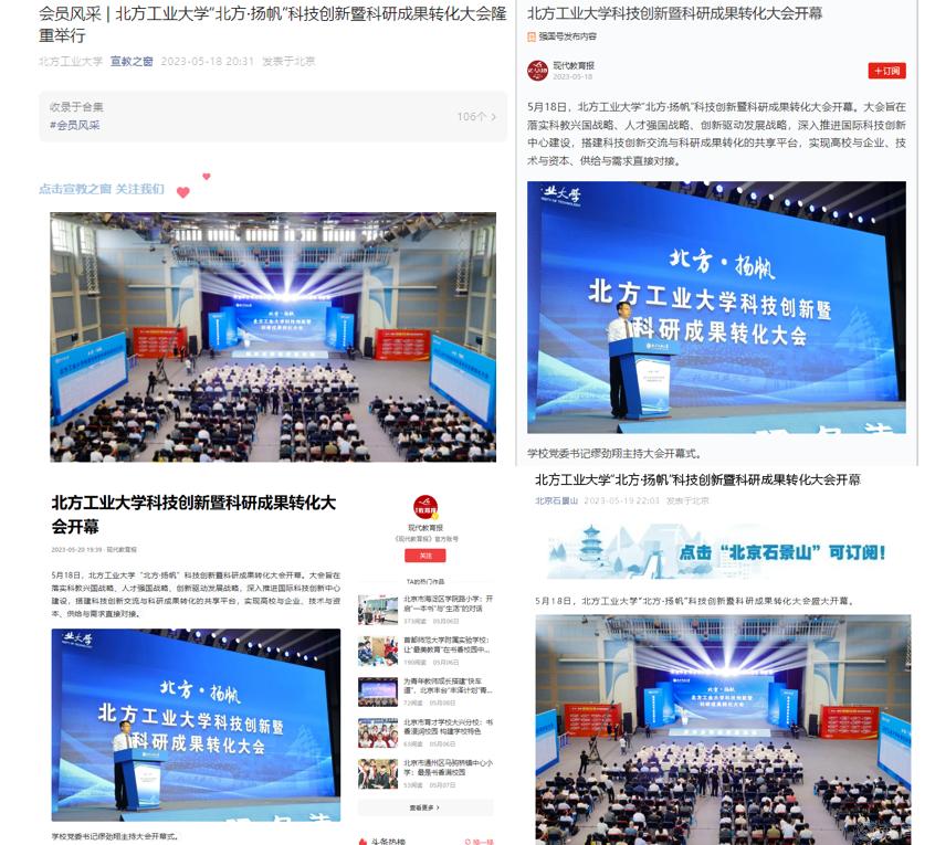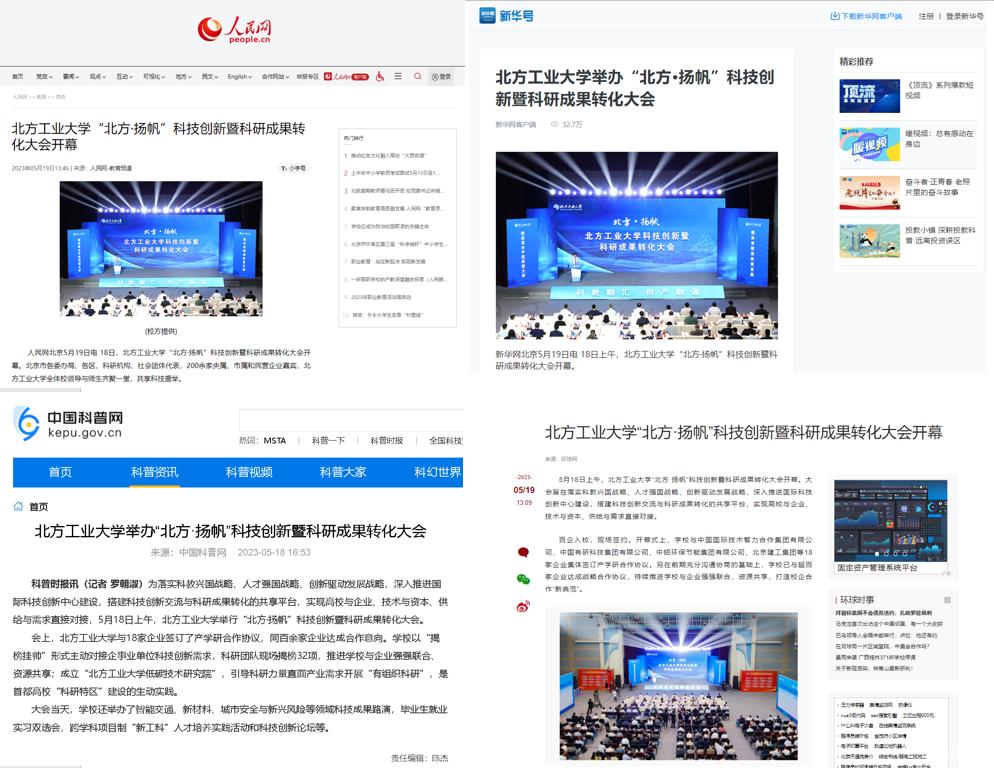5月18日,北方工業大學“北方·揚帆”科技創新暨科研成果轉化大會成功舉行,人民網、新華網、光明日報、北京電視臺等15家主流媒體對大會盛況進行了持續關注報道。