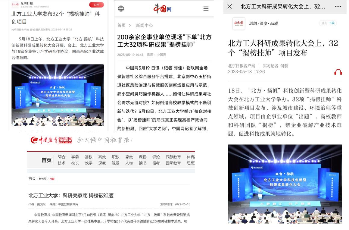 光明網、中國網、中國教育新聞網、北京日報、石景山新聞等媒體重點關注我校“揭榜掛帥”、激發科研人員活力、破解技術難題、推進產教融合的積極做法。中國教育新聞網以“科研亮家底  揭榜破難題”,肯定了學校對接企業需求、破解產業技術難題的有益探索。中國網以“200余家企事業單位現場‘下單’,北方工大32項科研成果‘揭榜掛帥’”為題,肯定了學校在推進科研成果與社會需求無縫對接和推動教學模式創新迭代的有益嘗試。