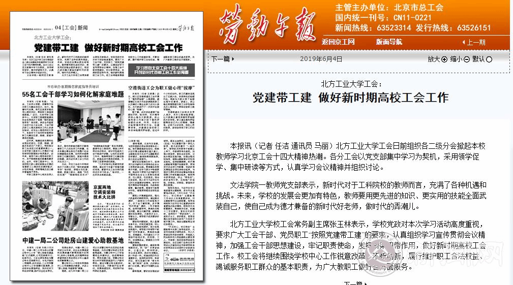 5月6日至8日,北京市工會第十四次代表大會勝利召開,為及時傳達會議精神,日前北方工業大學工會組織各二級分會掀起高校教師學習北京市工會十四大精神熱潮。6月4日,勞動午報發表了我校題為《黨建帶工建 做好新時期高校工會工作》的署名報道文章。