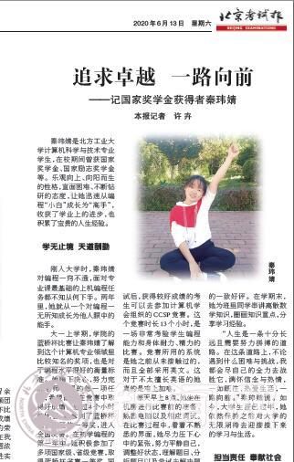 國家獎學金獲得者當代大學生中的佼佼者,是品學兼優學生的代表。日前,《北京考試報》在2020年6月13日第4、5版和6月27日第8、9版對我校國家獎學金獲得者秦瑋婧、楊曉陽、 和文輝同學的事跡進行了報道,體現了北方工大學生在磨礪中出彩,在奮斗中升華的精神風貌。