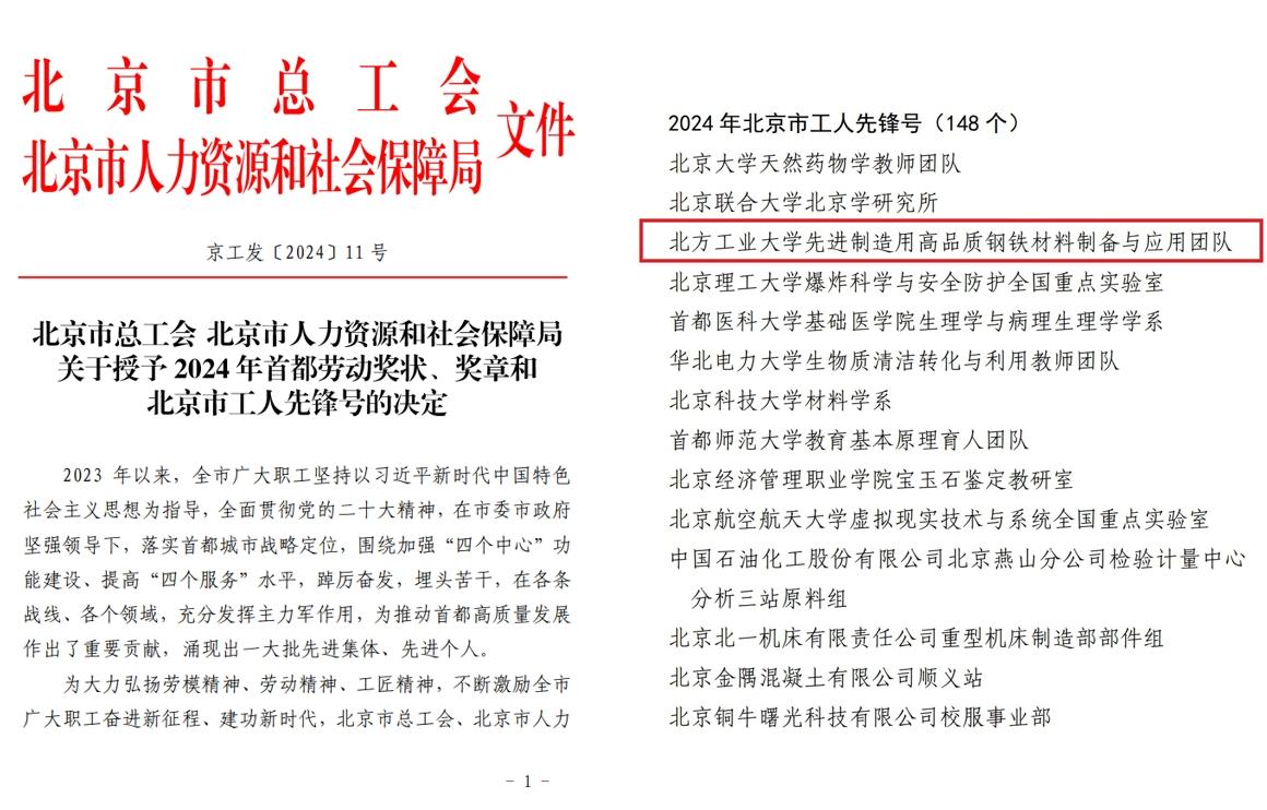 在“五一”勞動(dòng)節(jié)來(lái)臨之際,北京市總工會(huì)、北京市人力資源和社會(huì)保障局公布了2024年首都勞動(dòng)獎(jiǎng)狀、獎(jiǎng)?wù)潞捅本┦泄と讼蠕h號(hào)評(píng)選結(jié)果。我?!跋冗M(jìn)制造用高品質(zhì)鋼鐵材料制備與應(yīng)用”團(tuán)隊(duì)喜獲“北京市工人先鋒號(hào)”榮譽(yù)稱號(hào)。