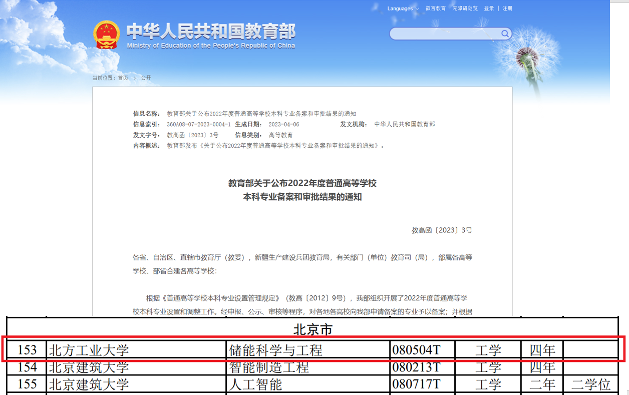 4月6日,教育部發(fā)布《關(guān)于公布2022年度普通高等學(xué)校本科專業(yè)備案和審批結(jié)果的通知》,我校成功獲批儲能科學(xué)與工程本科新專業(yè)。