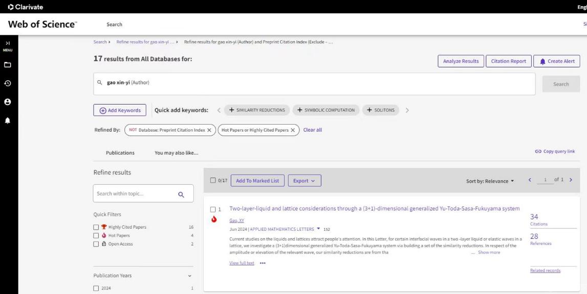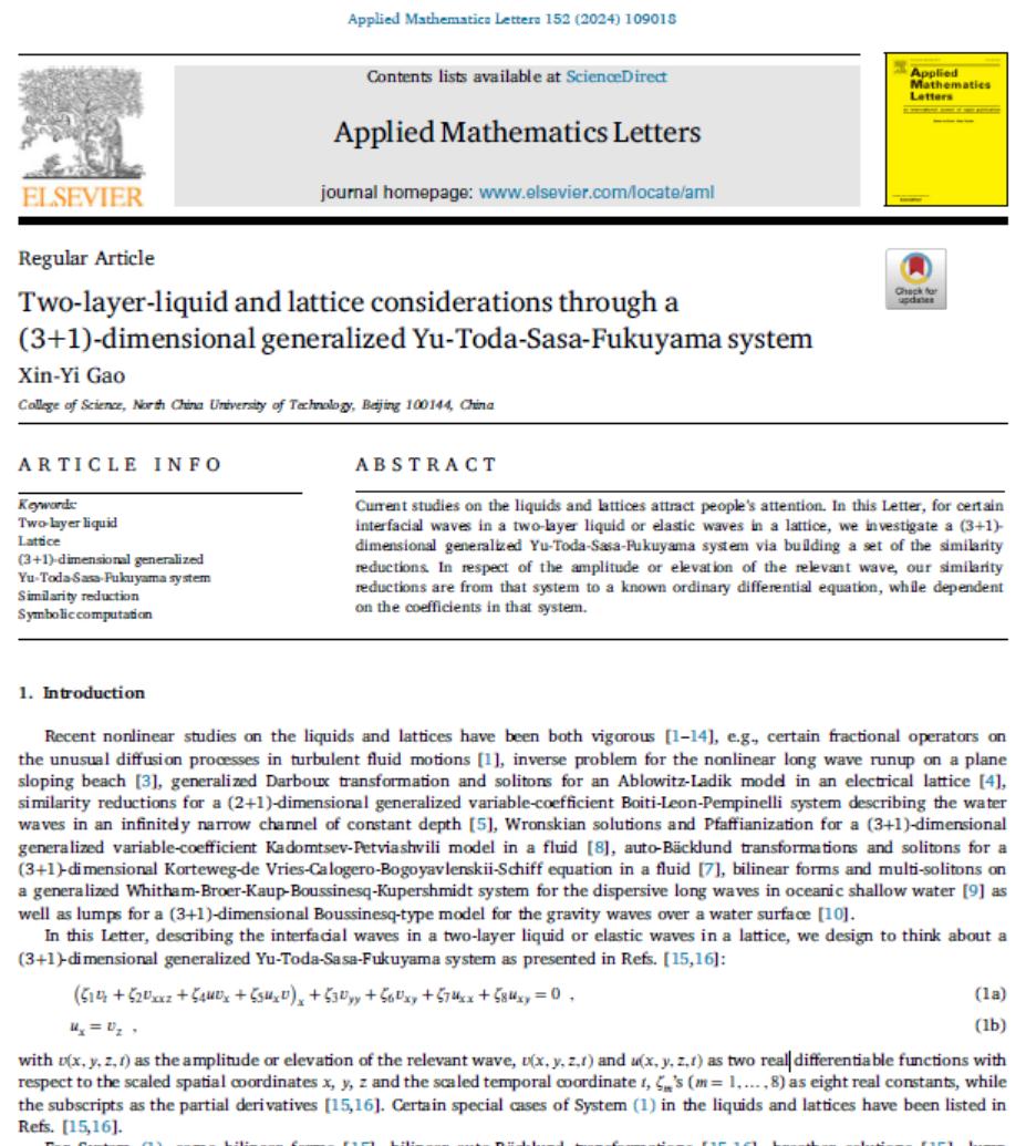 近日,我校理學(xué)院教師高心怡在Applied Mathematics Letters(應(yīng)用數(shù)學(xué)快報(bào))發(fā)表的標(biāo)題為Two-layer-liquid and lattice considerations through a (3+1)-dimensional generalized Yu-Toda-Sasa-Fukuyama system[通過(3+1)維廣義Yu-Toda-Sasa-Fukuyama系統(tǒng)考察雙層液體和晶格]的文章入選“ESI熱點(diǎn)論文”。