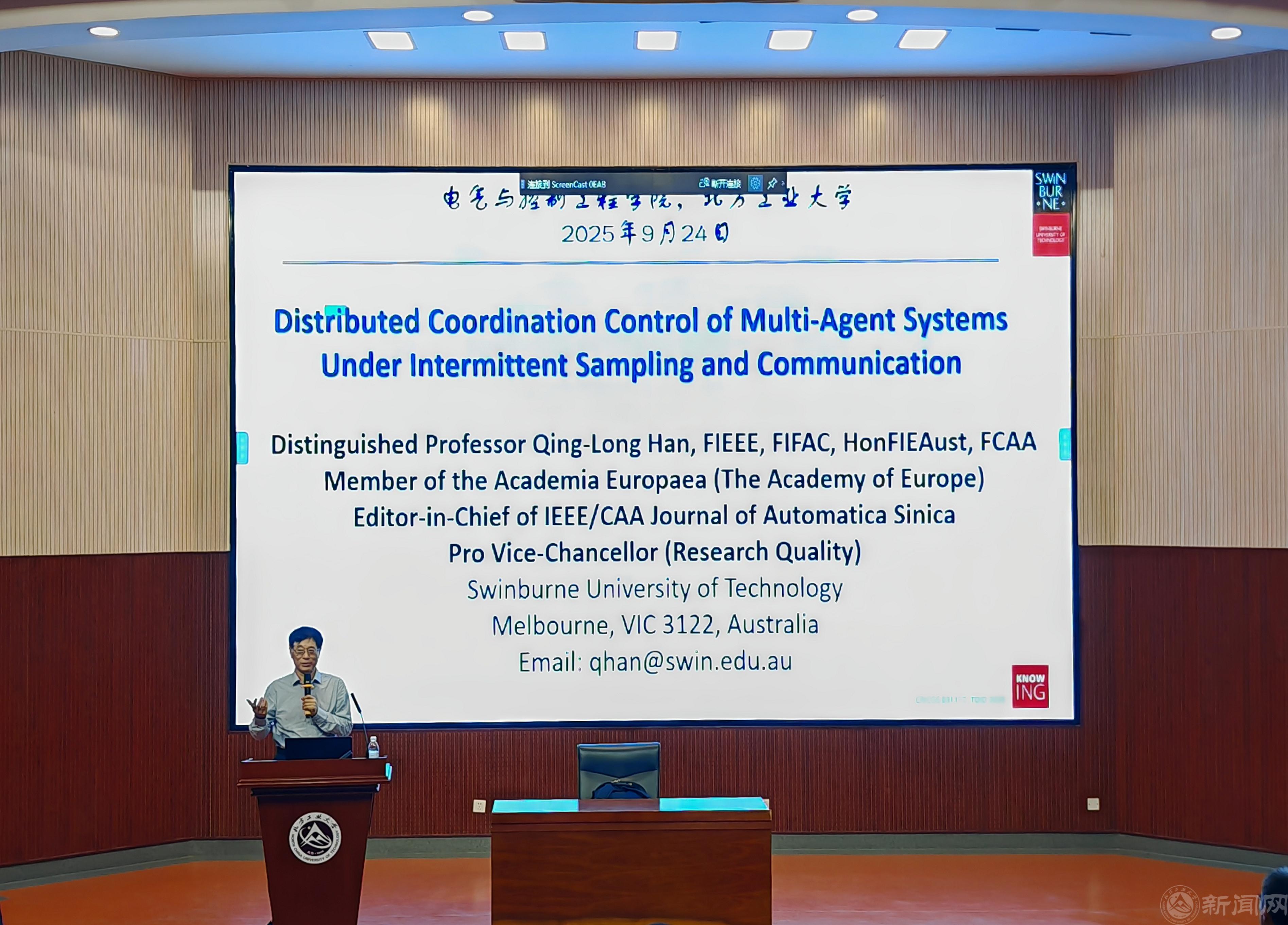 9月24日,歐洲科學院院士、澳大利亞斯威本科技大學副校長韓清龍教授在文化會堂為我校控制科學與工程學科博士新生講授了“控制科學與工程前沿專題”開學第一課。韓清龍院士以“Distributed Coordination Control of Multi-Agent Systems Under Intermittent Sampling and Communication”為主題,為博士生帶來了一場前沿學術盛宴。報告由電氣與控制工程學院院長董哲主持。