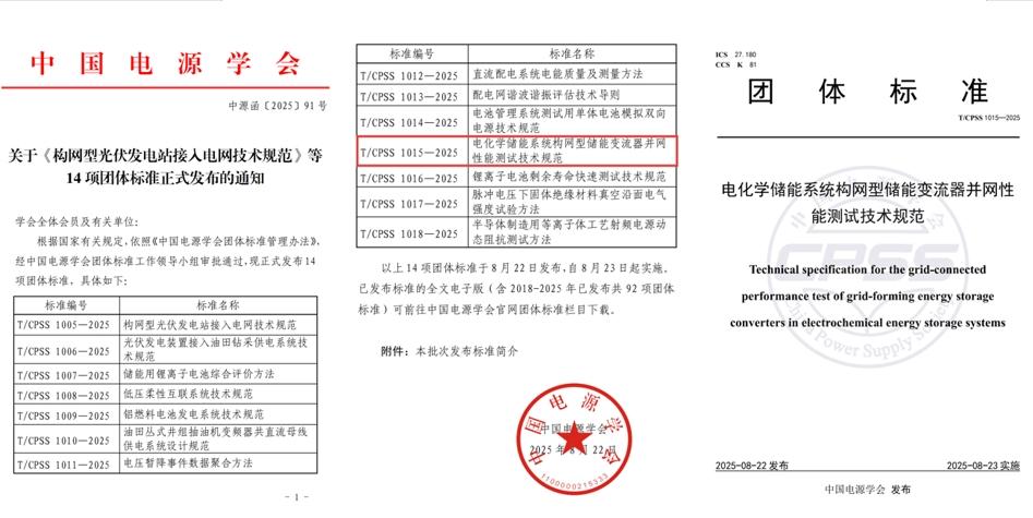 近日,由我校作為第一單位、儲(chǔ)能科學(xué)與工程學(xué)院周京華教授牽頭編制的團(tuán)體標(biāo)準(zhǔn)《電化學(xué)儲(chǔ)能系統(tǒng)構(gòu)網(wǎng)型儲(chǔ)能變流器并網(wǎng)性能測試技術(shù)規(guī)范》(T/CPSS1015—2025)經(jīng)中國電源學(xué)會(huì)團(tuán)體標(biāo)準(zhǔn)工作領(lǐng)導(dǎo)小組審查通過,于2025年8月22日正式發(fā)布,并于8月23日開始實(shí)施。