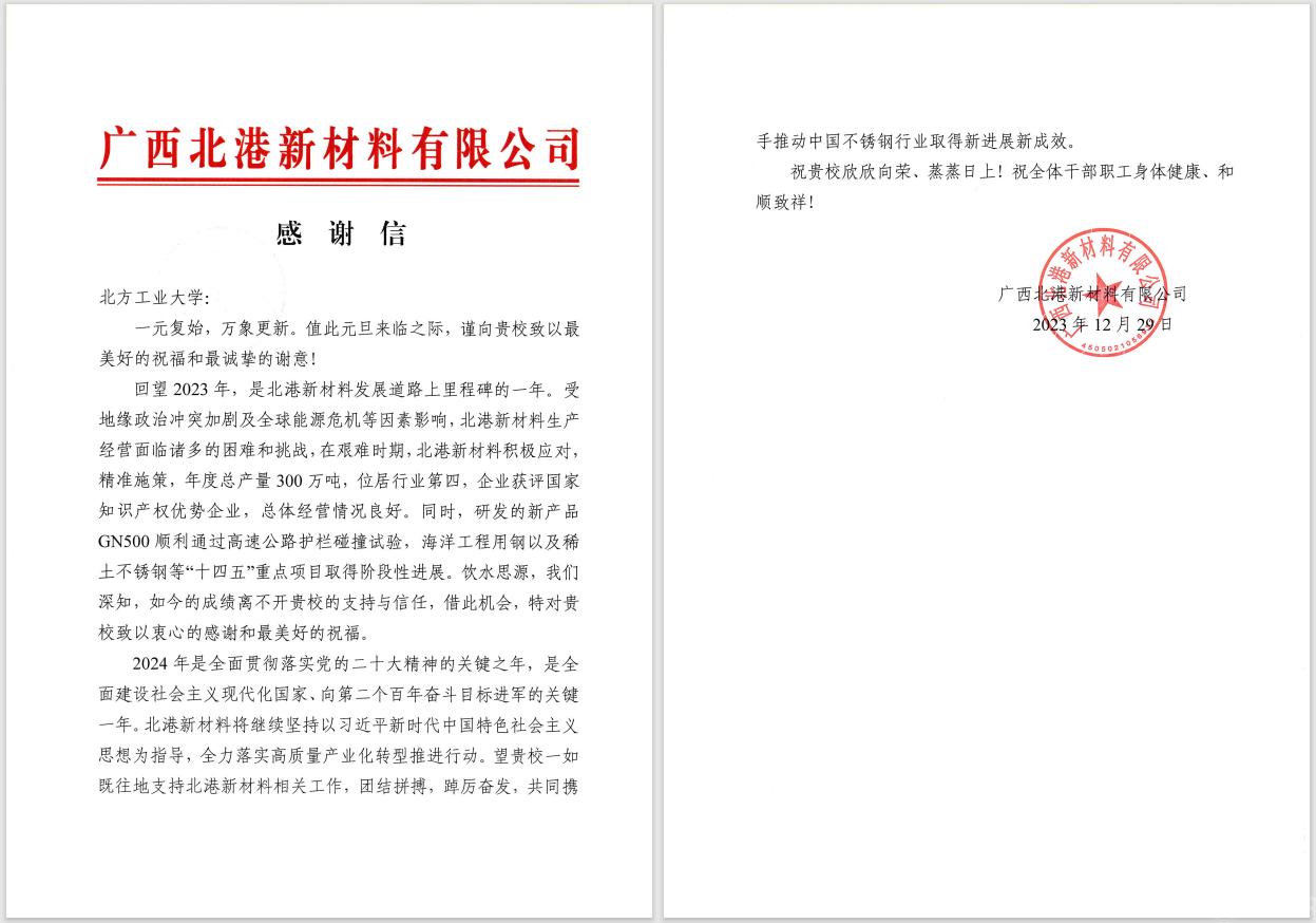12月29日,我校收到廣西北港新材料有限公司發(fā)來的感謝信,感謝張立峰校長團隊對北港新材料相關工作的支持與幫助。