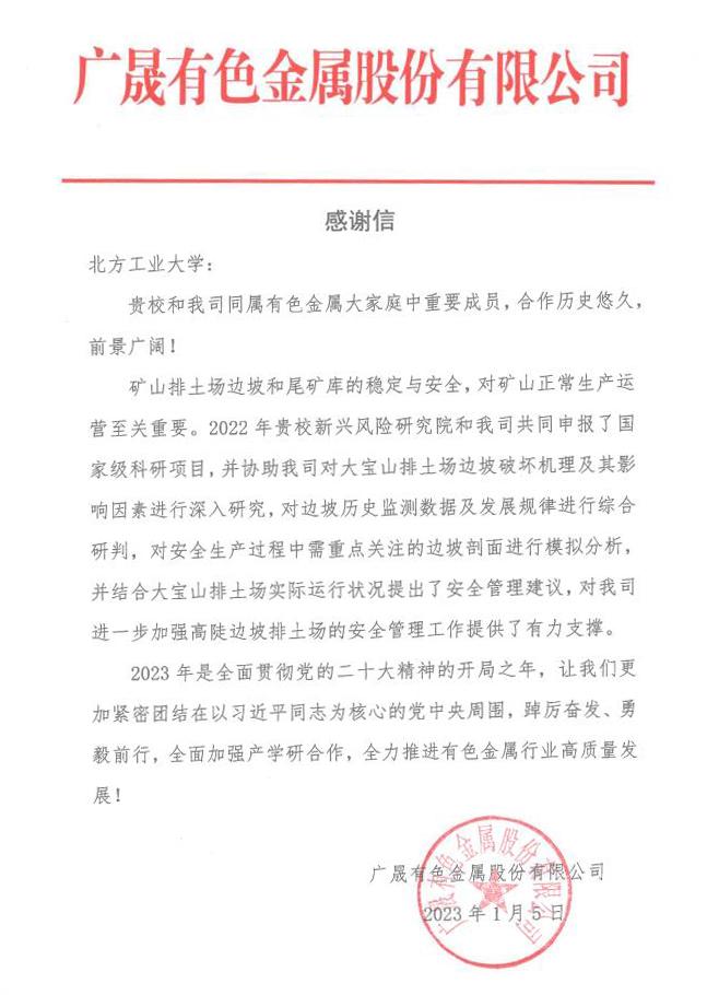 學校深入學習貫徹落實黨的二十大精神,促進科技成果轉移轉化,努力提升服務社會經濟發展能力。近日,廣晟有色金屬股份有限公司向學校發來感謝信,感謝過去一年學校為廣晟有色發展提供的支撐服務。