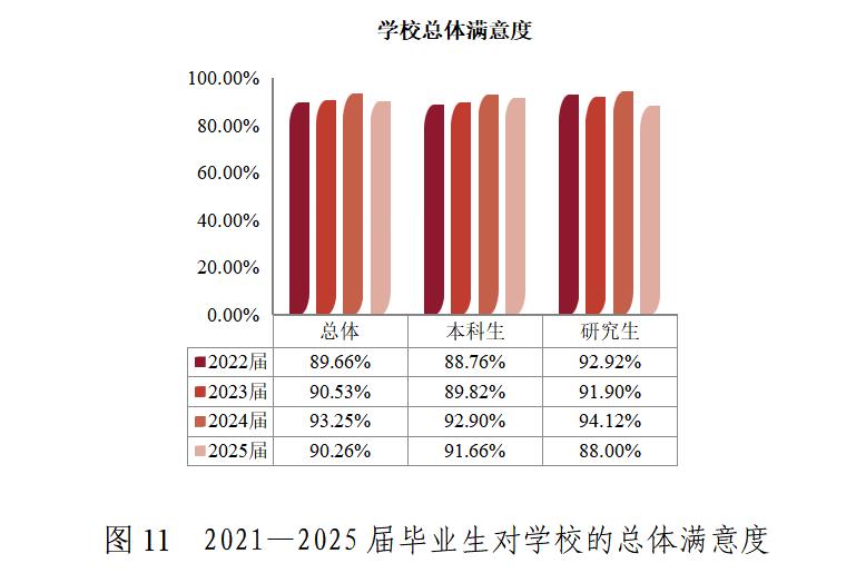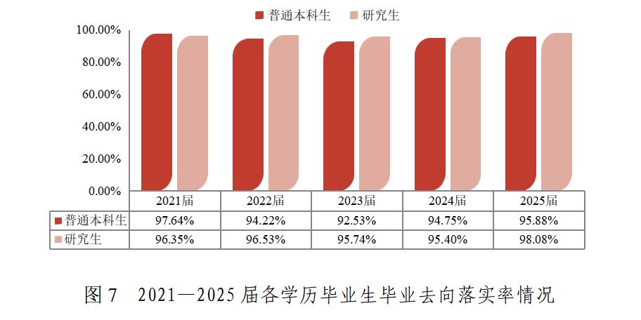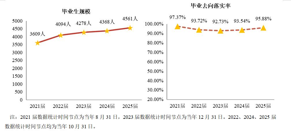 學(xué)校畢業(yè)生規(guī)模逐年遞增,2025屆畢業(yè)生總數(shù)達4561人。學(xué)校畢業(yè)生去向落實率保持穩(wěn)定。2025屆研究生畢業(yè)去向落實率達98.08%,普通本科生(不含二年制本科)落實率95.88%。