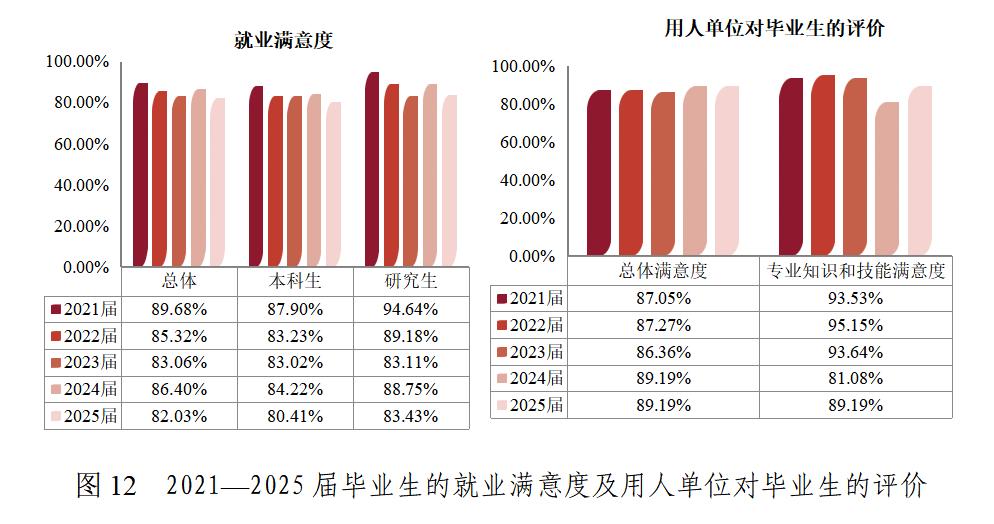 “十四五”期間,畢業(yè)生對學(xué)校的總體滿意度較高,穩(wěn)定在90%左右;畢業(yè)生就業(yè)滿意度穩(wěn)定在82%以上,用人單位對畢業(yè)生總體滿意度超過 86%,對專業(yè)知識和技能的滿意度保持在 90% 左右。