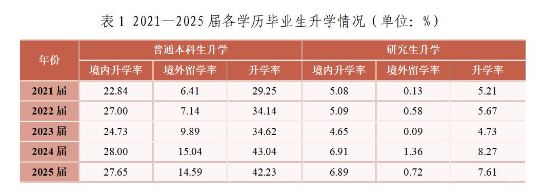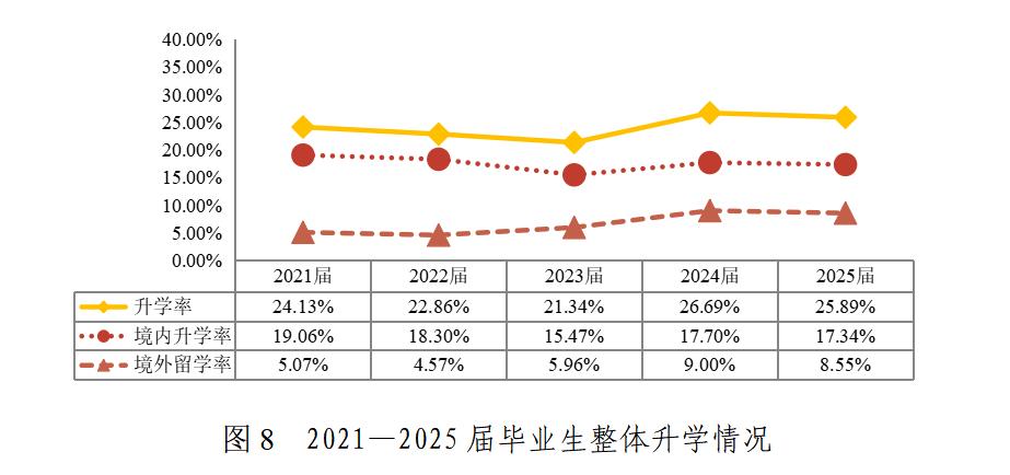 “十四五”期間,學(xué)校整體升學(xué)率保持增長,近兩屆保持在25%以上。學(xué)生升學(xué)意愿持續(xù)增強,2024屆和2025屆升學(xué)率分別達到43.04%和42.23%,研究生升學(xué)率在2025屆達到7.61%。境外留學(xué)率從2021屆的6.41%升至2025屆的14.59%,增幅明顯。