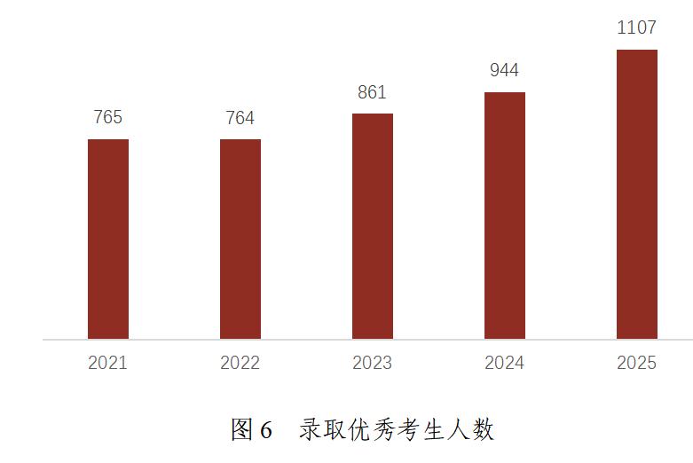 “十四五”期間,學(xué)校生源吸引力不斷增強,質(zhì)量穩(wěn)步提升。在全國20余招生地區(qū),理工科錄取平均分位居前10%左右。錄取優(yōu)秀考生人數(shù)逐年遞增,從2021年的765人增至2025年的1107人,五年間增長44.7%。
