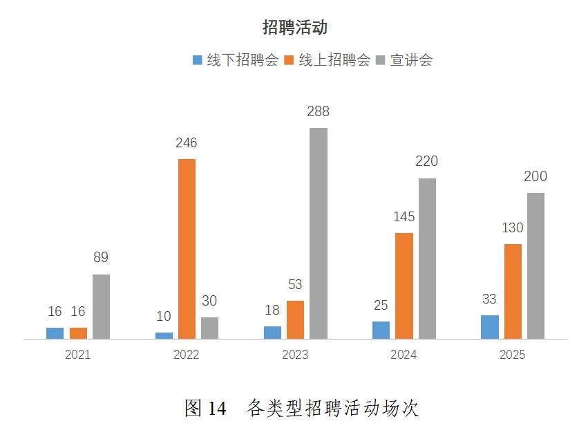 學(xué)校構(gòu)建了全員參與、全程、全方位的就業(yè)服務(wù)體系。“十四五”期間,線下招聘會從2021年的16場增至2025年的33場,線上招聘會最高年舉辦246 場,宣講會年均舉辦超200場,累計為畢業(yè)生提供崗位54萬個。