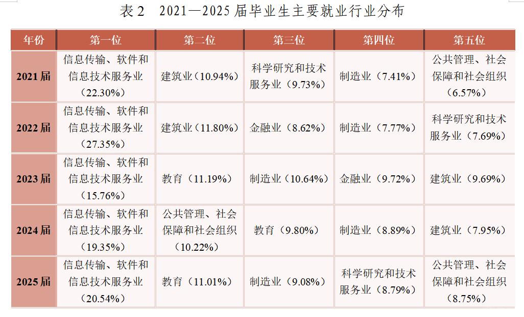 從行業(yè)分布來看,畢業(yè)生主要進入信息傳輸、軟件和信息技術(shù)服務(wù)業(yè),教育,制造業(yè)等領(lǐng)域,行業(yè)流向與學(xué)校以工為主、多學(xué)科協(xié)調(diào)發(fā)展的人才培養(yǎng)特點總體契合。近兩年畢業(yè)生到公共社會組織就業(yè)的人數(shù)稍有增加。