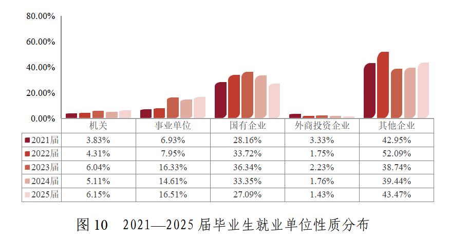 從單位性質(zhì)來看,企業(yè)是我校畢業(yè)生就業(yè)主陣地,合計吸納超七成畢業(yè)生。近三年畢業(yè)生到事業(yè)單位就業(yè)的比例顯著上升,約占16%。