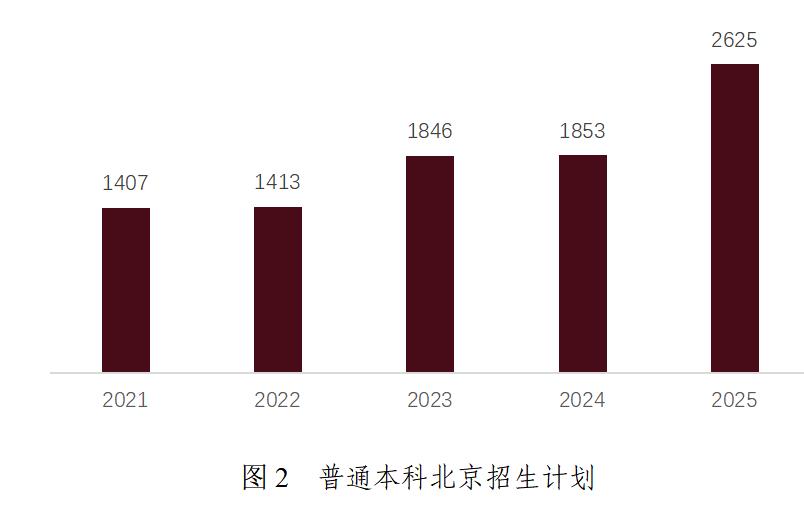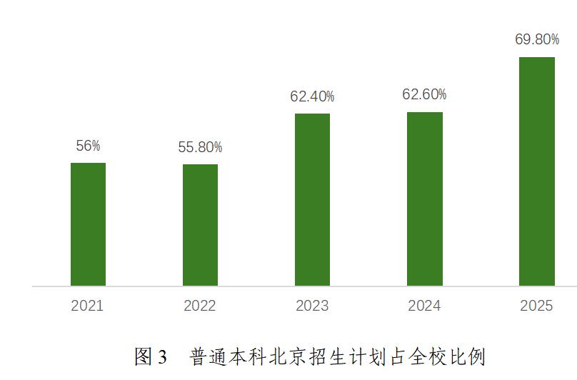 學(xué)校積極響應(yīng)首都教育“擴容提質(zhì)”要求,本科招生規(guī)模五年間增長38.99%。在京普通本科(不含專升本、二學(xué)位等)招生計劃增長明顯,從2021年的1407人增至2025年的2625人,增幅達87%,在全校普通本科招生計劃中的占比從56%提升至69.8%。