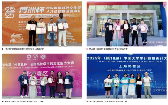 “十四五”期間,學校留學生在“大唐杯”全國大學生移動通信5G技術大賽、“外教社杯”全國高??缥幕芰Υ筚惖葒壹?、省部級競賽中屢獲佳績,累計榮獲國家級獎項15(一等獎4項)、省部級獎項26項。為培養知華友華的高素質國際人才筑牢根基,為增進中外文明交流互鑒搭建橋梁,為推動構建人類命運共同體注入青春力量。