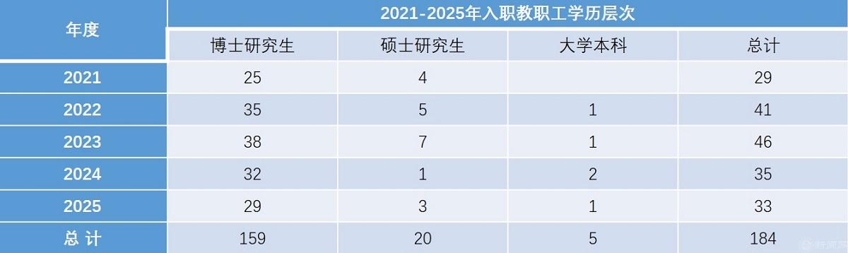 “十四五”期間人才引進成效顯著。2021-2025年學校共引進教職工184人,其中北方學者7人、其他高層次人才9人、師資補充141人、輔導員、軍轉干部等27人;師資引進層次顯著提高,具有博士學歷159人,占比高達86.4%;學術背景與學緣結構顯著優化,具有兩個及以上高水平大學或海外留學經歷的新進教師共計48人,具有三段此類經歷的教師45人。